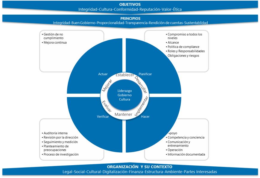 La norma, además, está regida por principios como integridad, buen gobierno, proporcionalidad, transparencia, rendición de cuentas y sustentabilidad. Cuenta con todo un asidero teórico y filosófico para garantizar que la implementación del sistema de gestión de cumplimiento se internalice mediante la toma de consciencia que ayude a que los colaboradores asuman comportamientos éticos, de cara a la creación y consolidación de organizaciones capaces de internalizar sus compromisos con los trabajadores, partes interesadas y con el entorno del que forman parte.