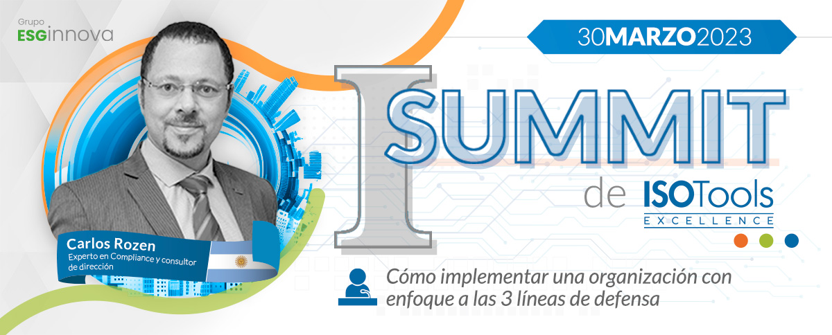 ISOTools, parte del Grupo ESG Innova, celebra el jueves 30 de marzo de 2023 su I Summit con motivo de celebrar sus primeros 25 años liderando la transformación digital de las organizaciones en todo el mundo. Como parte de este I Summit, que contará con la intervención de panelistas de primer nivel, encontramos una ponencia acerca de las conocidas tres líneas de defensa de la organización. Esta conferencia está a cargo de Carlos Rozen, Socio de BDO en Argentina con casi 25 años de experiencia, y de Katerine Villegas, Product Owner de ISOTools Compliance en ESG Innova y se celebrará dentro del programa I Summit ISOTools a las 17:00 hora de Madrid, España. Puedes consultar la correspondencia con el horario de tu país e inscribirte haciendo clic aquí.